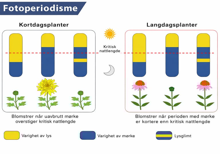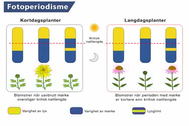 Planter trenger lys for å vokse, men lys handler ikke bare om energi til fotosyntese. Like viktig er lyssyklusen – altså hvordan lys og mørke veksler i løpet av et døgn. Dette fungerer som en slags biologisk klokke som forteller planten når den skal vokse, blomstre eller gå i hvile.